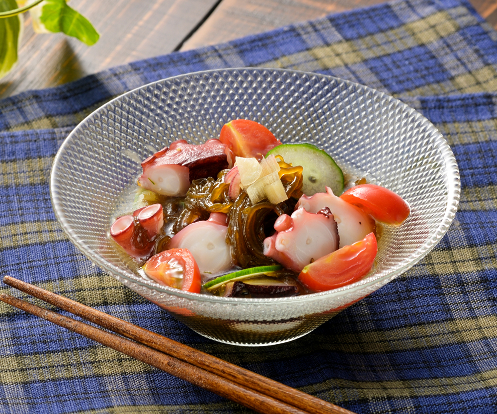 プリッとしたたこと、つるっとしたもずくの食感が楽しい一品。しょうがの香りが食欲を引き立て、トマトときゅうりの彩りで見た目も爽やかです。さっぱりとした味わいで、疲労回復や美容にもおすすめ。ポン酢や三杯酢でさっと和えるのが美味しさのポイント。
