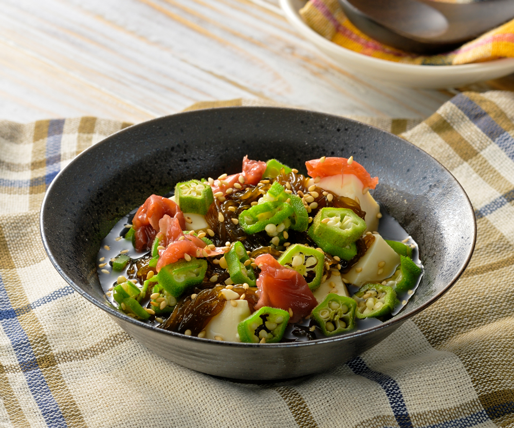 ねばねば食材のオクラと、酸味のある南高梅を組み合わせた、体にやさしい和え物です。梅のクエン酸が疲労回復を助け、もずくのフコイダンが腸内環境を整えます。胡麻の香ばしさがアクセントになり、さっぱりしながらも満足感のある味わい。夏場や食欲のないときにもぴったりです。